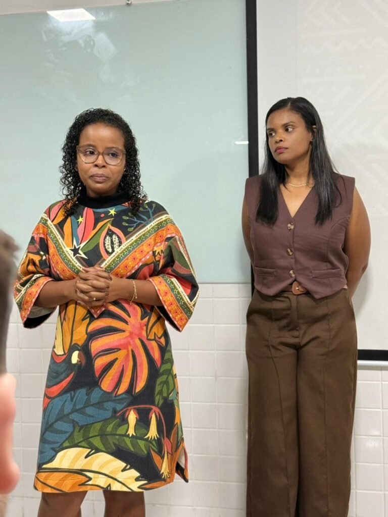 Para aprofundar o debate, Karine levou como convidada Mônica, professora da Educação Infantil Municipal de Abre Campo, que compartilhou um depoimento significativo sobre suas vivências e sobre o racismo presente no cotidiano escolar.